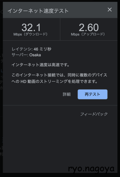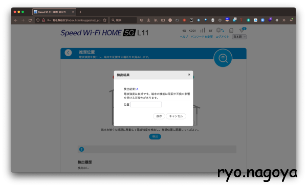 検出結果:Aで名古屋市守山区守牧町の部屋の中でも電波が届きました!さすがWiMAX